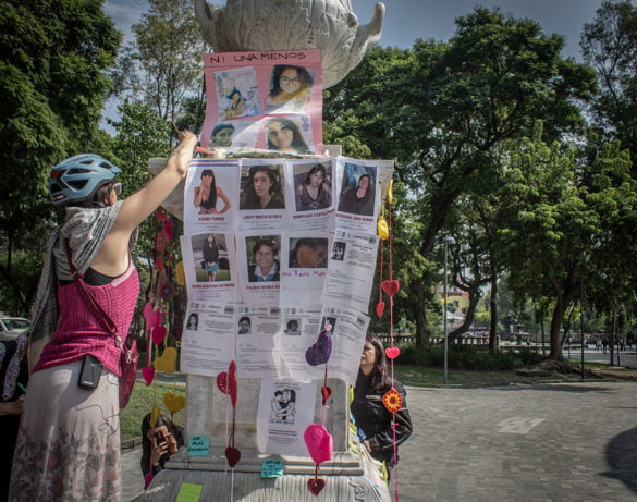 Con el gancho y el estambre entre sus dedos, algunas mujeres sentadas en la jardinera del lado izquierdo del Monumento, tejían corazones de tamaños variados. Las que se encontraban paradas colocaban fichas de búsqueda de mujeres desaparecidas y fotos de mujeres que fueron asesinadas, al igual que cruces de color negro y senos femeninos tejidos, los cuales colocaron en una urna.