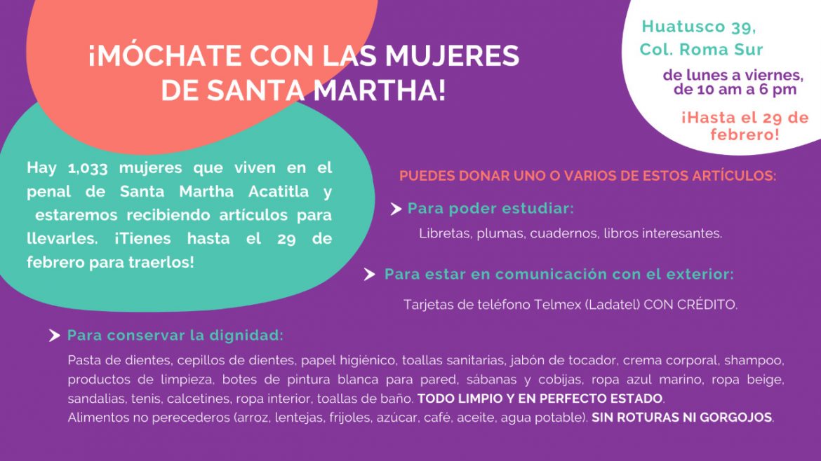 Esta iniciativa consiste en una colecta de libros, cuadernos, plumas, crema, acondicionador, toallas, ropa nueva, jergas, detergentes, tarjetas de teléfono y pintura blanca para paredes, para mujeres que se encuentran en ese Centro de Reinserción Social femenil, Santa Martha Acatitla.