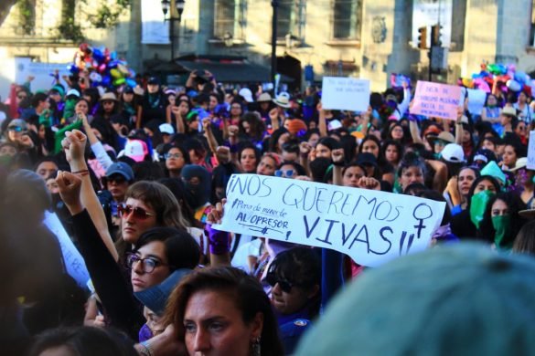 Un mosaico de consignas se empalma ente las calles principales del Centro Histórico. “Señor, señora, no sea indiferente, se mata a las mujeres en la cara de la gente”, “América latina será toda feminista”, “Mujer, escucha, esta es tu lucha”. A su paso, las intervenciones hechas por el contingente reflejan el contexto: ¡México feminicida!, ¡Estamos hartas!, ¡Ni una menos!, “No estamo todas, nos faltan las asesinadas!