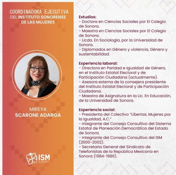 Mireya Scarone Adarga es doctora en Ciencias Sociales por El Colegio de Sonora y cuenta con diplomados sobre Género y violencia; y Género y sustentabilidad.
