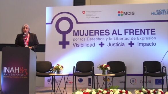 Alejandra Gómez reconoció el trabajo de las defensoras de Derechos Humanos y las periodistas como la conciencia y voz de México. Durante el foro se resaltó que las interseccionalidades de ser mujer, periodista y defensora de DD. HH. representan una vulnerabilidad adicional para las mujeres.