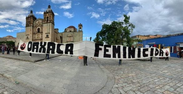 Un performance, colocación de un esténcil y el despliegue de una manta de 25 metros con la leyenda “Oaxaca feminicida”, así como la exhibición de una pancarta con la cifra de feminicidios al lado del gobernador del estado, Alejandro Murat Hinojosa, durante el desfile de delegaciones que participaron en la Guelaguetza, conformaron las protestas pacíficas contra los feminicidios y la exigencia de justicia a las víctimas en Oaxaca.