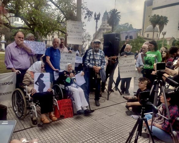 La lucha de las Madres de Plaza de Mayo es acompañada por otras y otros, cercanos, familiares, personas que van pasando y se suman respetuosamente para escuchar a las madres, algunas de ellas en silla de ruedas tras el transcurso de los años.