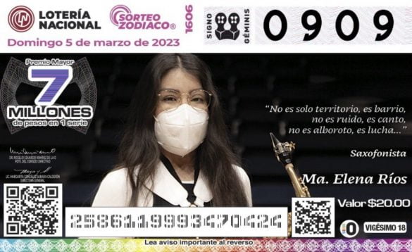 La imagen de la saxofonista oaxaqueña y activista emergente, María Elena Ríos Ortiz, fue colocada en el billete de la Lotería Nacional. La presentación de esta edición del billete será el próximo jueves 2 de marzo en el Complejo Cultural Los Pinos.