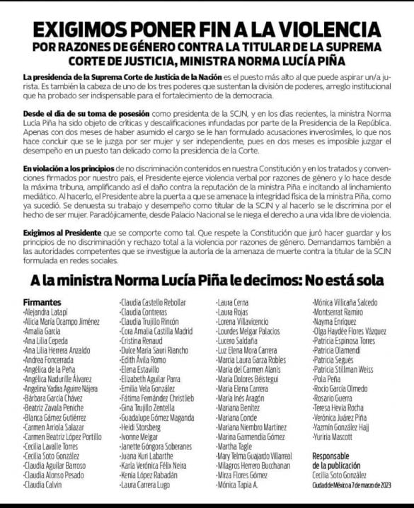 Las firmantes señalan que la presidencia de la Suprema Corte de Justicia de la Nación es el puesto más alto al que se puede aspirar un jurista y también la cabeza de uno de los 3 poderes por tanto exigieron al presidente:
