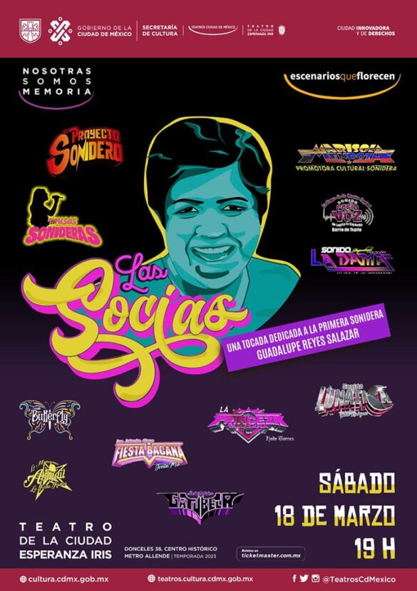 El próximo 18 de marzo en el Teatro de la Ciudad Esperanza Iris se llevará a cabo el espectáculo Las Socias, una tocada de Musas Sonideras dedicada a Guadalupe Reyes Salazar, la primera mujer sonidera que comenzó su trayectoria en 1967 con el sonido Aves del Paraíso, mismo que renombró con el nombre de su apodo: La Socia.