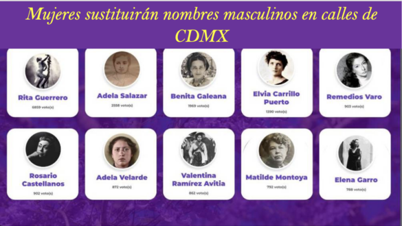 Ciudad de México.- Un listado de 10 mujeres que han destacado en activismo y luchas sociales sustituirán los nombres de algunas calles de la Ciudad de México, identificadas con personajes señalados por actos de violencia en el pasado histórico del país, como son Gustavo Díaz Ordaz y Antonio López de Santa Anna, pero ahora las vialidades tendrán nuevos identificadores como son: Rita Guerrero, Adela Salazar, Benita Galeana, Elvia Carrillo Puerto, entre otras.