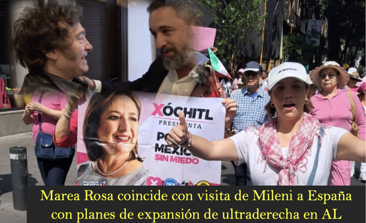 Ciudad de México.- La conocida “Marea Rosa”, llenó el zócalo de la Ciudad de México en una concentración donde la aspirante presidencial Xóchitl Gálvez, logró un evento que según datos del gobierno de México alcanzó 90 mil asistentes, el cual coincidió este 19M, con la visita del presidente argentino, Javier Milei, a España, quien se reunió con representantes del partido de ultraderecha español Vox con planes de expansión del conservadurismo en América Latina y es de resaltar que uno de los acompañantes en la coalición que acompaña a la candidata mexicana son simpatizantes de esta derecha radical: Partido Acción Nacional.