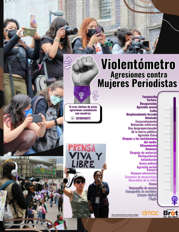 Ciudad de México.- A raíz de las violencias que las mujeres periodistas enfrentan por el ejercicio de su labor profesional, Comunicación e Información de la Mujer (CIMAC) esta mañana presentó el Violentómetro de Agresiones contra periodistas y lo hizo luego de desarrollar una metodología para el registro, documentación y acompañamiento feminista de casos, por lo que esta herramienta permitirá identificar el riesgo e incremento de agresiones y así se pueda actuar a tiempo con acciones de contención o atención inmediata para salvaguardar su integridad y vida.