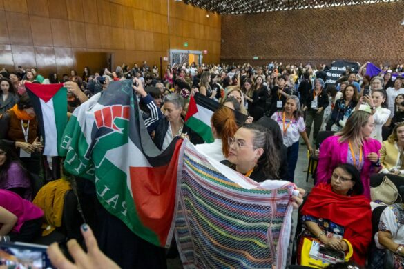 Ciudad de México.- Al grito de «Palestina libre» las asistentes presentes en el cierre de la XVI Conferencia Regional sobre las Mujeres en América Latina y el Caribe, nombraron la lucha de las palestinas, quienes se encuentran en medio de una guerra y con violaciones a sus derechos humanos, por eso al unísono corearon consigas de apoyo para el pueblo palestino y se puso observar cómo ondeaba la bandera de aquél país en medio de la sala.