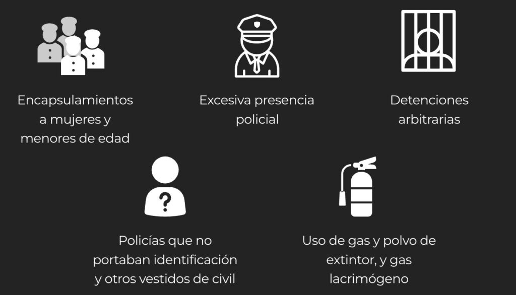 La vulneración al derecho a la protesta feminista en México, por parte de autoridades de todos los niveles de gobierno, se ha convertido en una práctica cada vez más frecuente reforzada por actos sistemáticos, como el uso de discursos institucionales, que criminalizan y estigmatizan las movilizaciones sociales, y que se materializan a través de prácticas como: