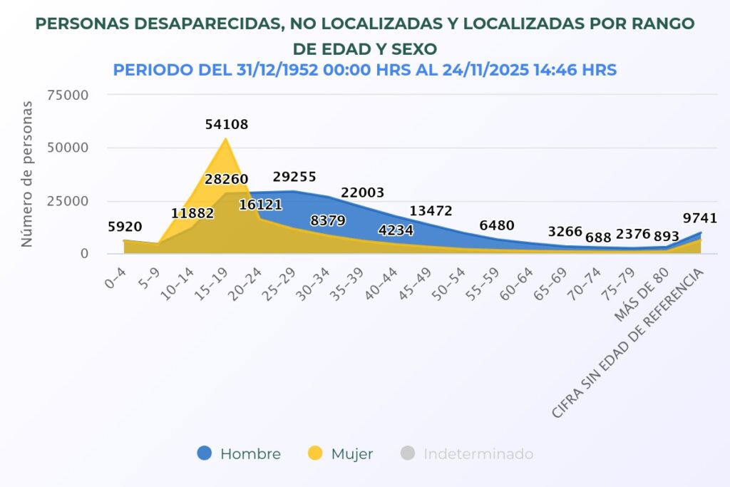 De acuerdo con datos del Registro Nacional de Personas Desaparecidas y No Localizadas (RNPDNO), este 2025 el número de personas desaparecidas superó los 130 mil. Al corte del 24 de noviembre de 2025 se contabilizaron 133 mil 625 personas desaparecidas de las cuales 29 mil 743 son mujeres y con ello se revierte una tendencia, son las mujeres jóvenes antes de cumplir los 20 años, las que principalmente desaparecen.