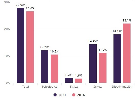 De acuerdo con la Encuesta Nacional sobre la Dinámica de las Relaciones en los Hogares (ENDIREH) 2021, del 79.3% de las mujeres que alguna vez han trabajado en su vida, el 27.9% experimentó algún tipo de violencia en el ámbito laboral, 18.1% experimentó discriminación laboral, 14.4% vivió situaciones de violencia sexual, 12.2% violencia psicológica y 1.9% violencia física.