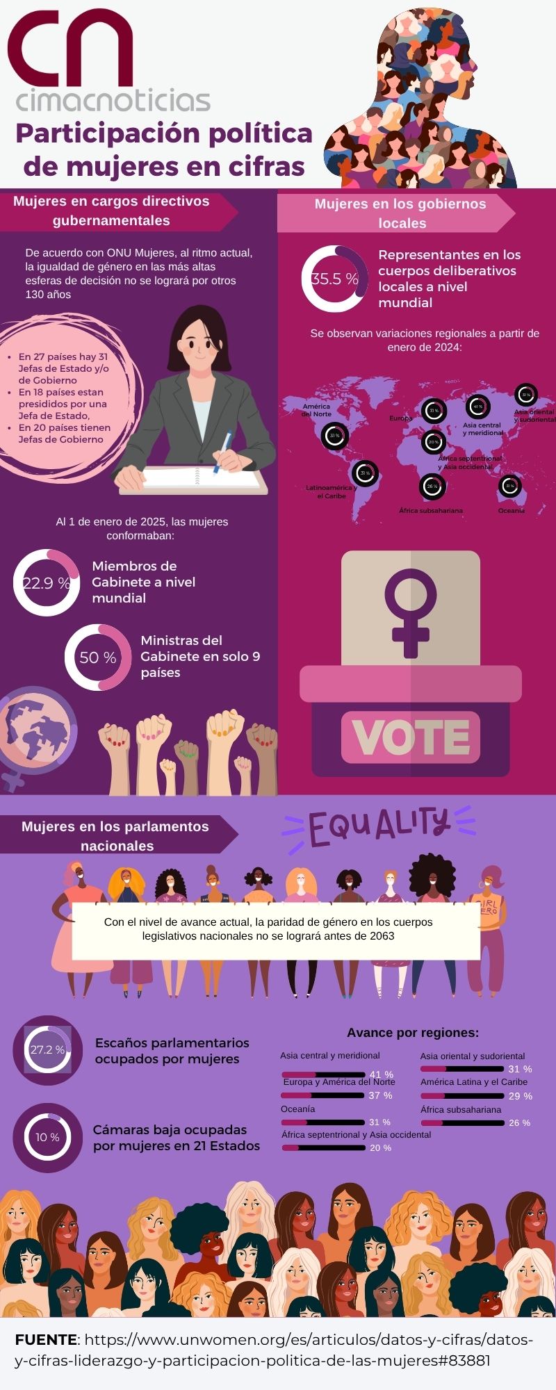 De acuerdo con ONU Mujeres, la participación y liderazgo de las mujeres en la política y en la vida pública en igualdad son dos ejes fundamentales para alcanzar los Objetivos de Desarrollo Sostenible (ODS) antes del 2030; sin embargo, los datos registrados muestran que la representación de las mujeres es insuficiente en todos los niveles de toma de decisiones en el mundo imposibilitando alcanzar la paridad de género en todas sus letras, por eso es fundamental seguir abriendo espacios.