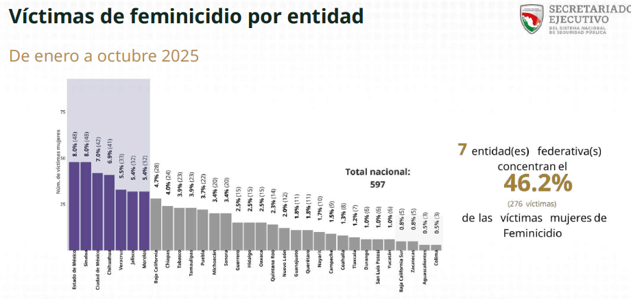 Ciudad de México. – En México, de enero a octubre de 2025 se registraron un total de 5 mil 020 asesinatos contra mujeres; sin embargo, solo 597 casos fueron tipificados como feminicidio, según datos del informe Información sobre violencia contra las mujeres: Incidencia delictiva y llamadas de emergencia 9-1-1 del Secretariado Ejecutivo del Sistema Nacional de Seguridad Pública cuyo corte es hasta el mes de noviembre, es decir, aún faltarían registrar y sumar los casos de diciembre.