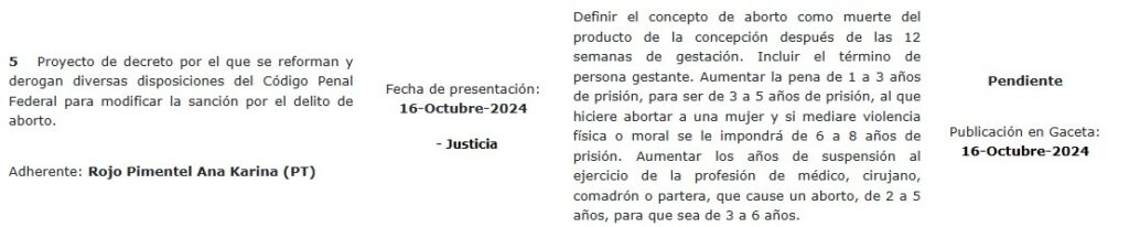 En octubre de 2024, el grupo parlamentario de MORENA plateó la reformación de los artículos 330° al 334° del Código Penal Federal, ya que la ley vigente ordena de uno a tres años de prisión a quien práctique un aborto y de dos a cinco años si lo realiza un médico, comadrón o partera. La forma en que están redactadas las leyes criminaliza a las mujeres que eligen interrumpir su embarazo para priorizar su proyecto de vida, como resultado, el informe «Maternidad o castigo» de GIRE documentó que entre 2015 a 2022 se abrieron 5 mil 130 carpetas de investigación por aborto.
