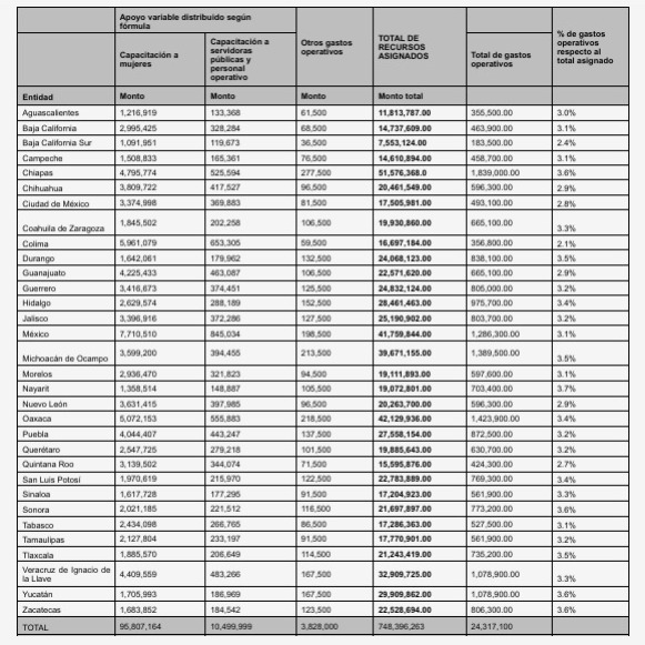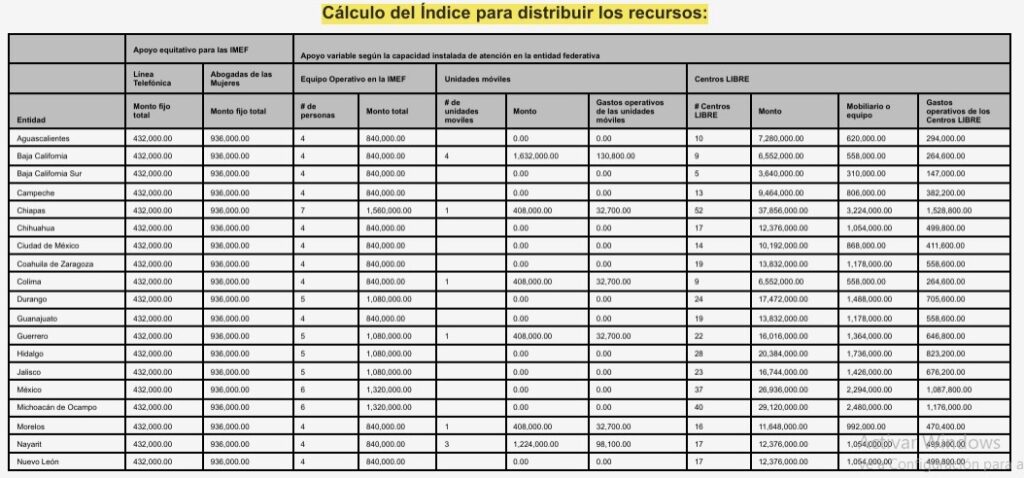 Para la repartición del recurso se toma la fórmula TRA=AEIMEF+AVCIA+AVSF, es decir, la suma del Apoyo equitativo para las Instancias de Mujeres en la Entidades Federativas, el Apoyo variable según la capacidad instalada de atención, y el Apoyo variable distribuido según fórmula. Esta se distribuye entre el equipo operativo en la Instancia de las Mujeres en las Entidades Federativas (IMEF), 17 unidades móviles de atención distribuidas en 9 entidades, gastos operativos de las unidades móviles, gastos operativos y la atención integral de las mujeres en los Centros LIBRE, así como mobiliario y equipo para estas instancias.