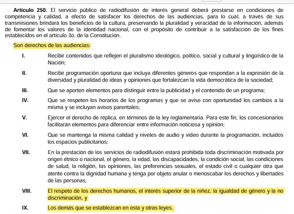 La entrevista quedó fuera del aire después que la Defensoría de la Audiencia de Canal Once analizara el contenido y determinara que no se ajustaba a los principios de la institución por contener violaciones a los derechos de las audiencias, específicamente promover una noción política contraria a los derechos fundamentales de las mujeres y otros grupos en situación de vulnerabilidad señalados en el artículo 250 de la Ley en Materia de Telecomunicaciones y Radiodifusión.