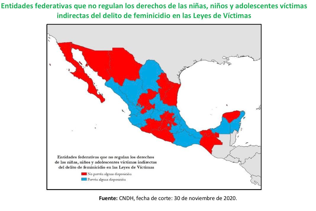 Un diagnóstico de la Comisión Nacional de Derechos Humanos (CNDH) del 2020 indicó que a nivel federal la Ley de General de Víctimas prevé medidas de rehabilitación especial hacia las hijas e hijos y adultos mayores dependientes de una víctima al considerarlos que fueron afectados de forma indirecta.