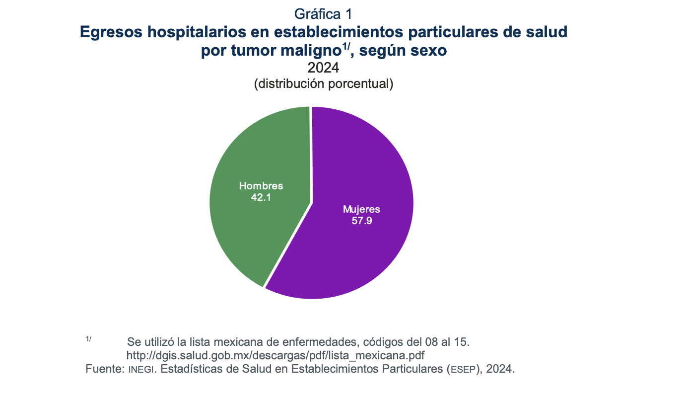 En 2024, la Estadística a propósito del Día Mundial contra el Cáncer del Instituto Nacional de Estadística y Geografía (INEGI), publicada en este 2026, reportó que, en 2024 las Estadísticas de Salud en Establecimientos Particulares (ESEP) reportaron como morbilidad hospitalaria 2 millones 273 mil 261 egresos hospitalarios. De los cuales 57 mil 019 (2.5 %) tuvieron como diagnóstico algún tumor maligno y de estos 57.9 % correspondió a mujeres y 42.1 % a hombres.