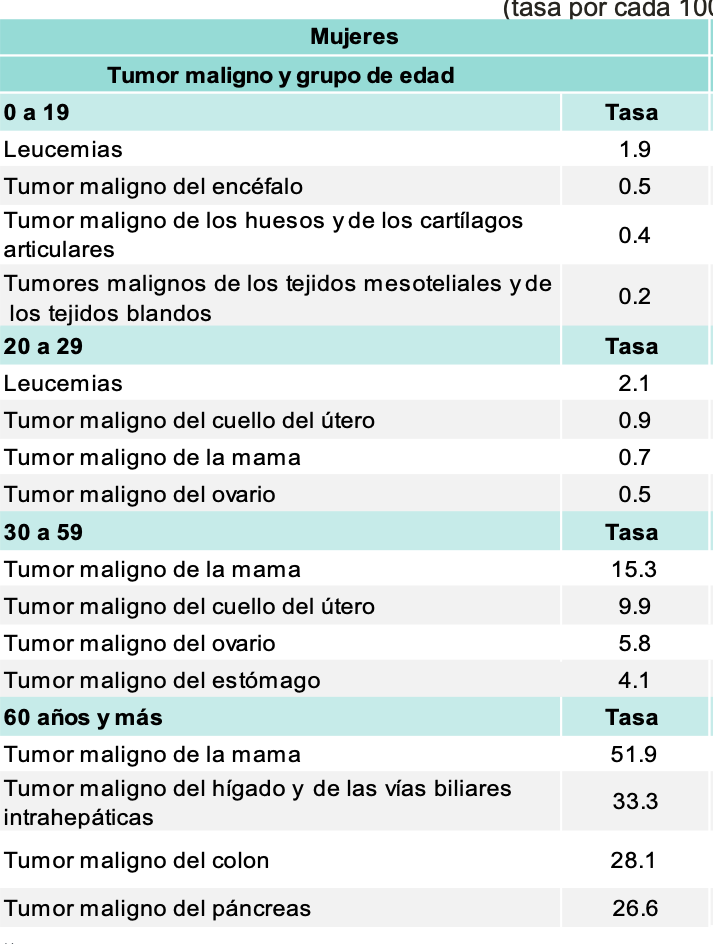 La leucemia fue el cáncer con la tasa de mortalidad más alta entre la población de 0 a 19 años. En las mujeres fue 1.9 por cada cien mil habitantes y de 2.4 en los hombres. En el grupo de 20 a 29 años, la leucemia también fue la mayor causa de mortalidad por cáncer entre las mujeres (2.1), en cambio en los hombres correspondió al tumor maligno del testículo (3.4). A partir de los 30 años, el tumor maligno de la mama tuvo las tasas de mortalidad por cáncer más altas entre las mujeres; en los hombres de 30 a 59 años fue el tumor maligno del colon (4.8) y en el grupo de 60 años y más fue el tumor maligno de la próstata (97.9).
