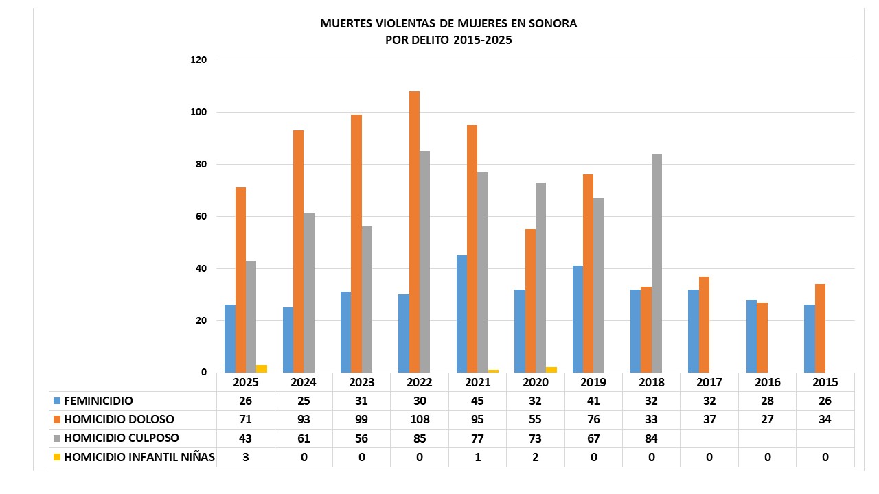 Según el reporte mensual más reciente del SESNSP 140 mujeres fueron asesinadas en Sonora durante 2025, muertes violentas a las que se agregan las de tres niñas cuyos casos fueron clasificados como homicidio infantil.