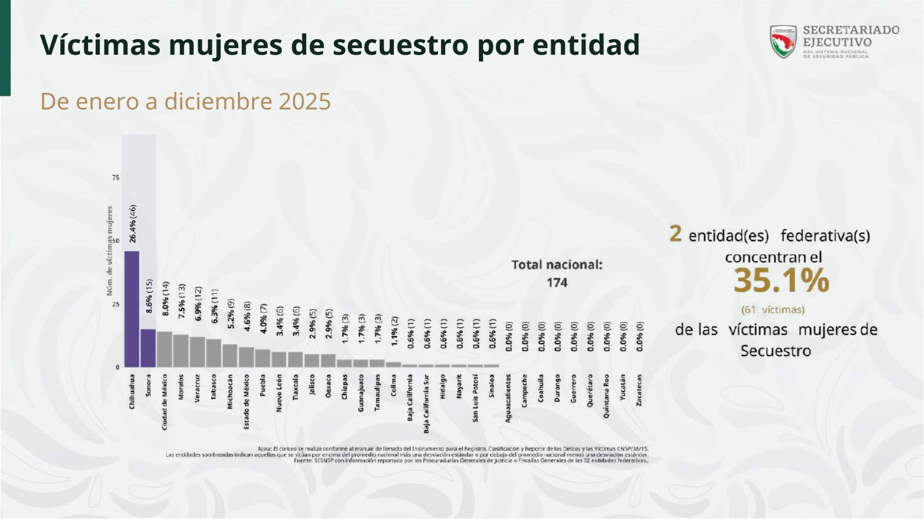 El mismo reporte especifica que ambas entidades federativas concentran 35.1% de las víctimas mujeres de secuestro.