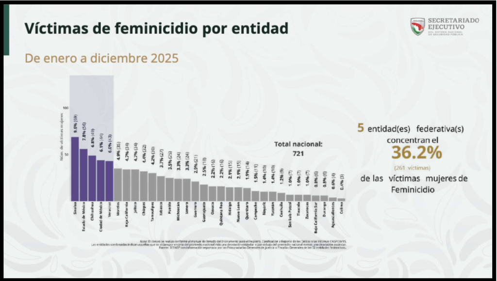 En 2025 México registró 721 casos de feminicidio. Sinaloa ocupó primer lugar