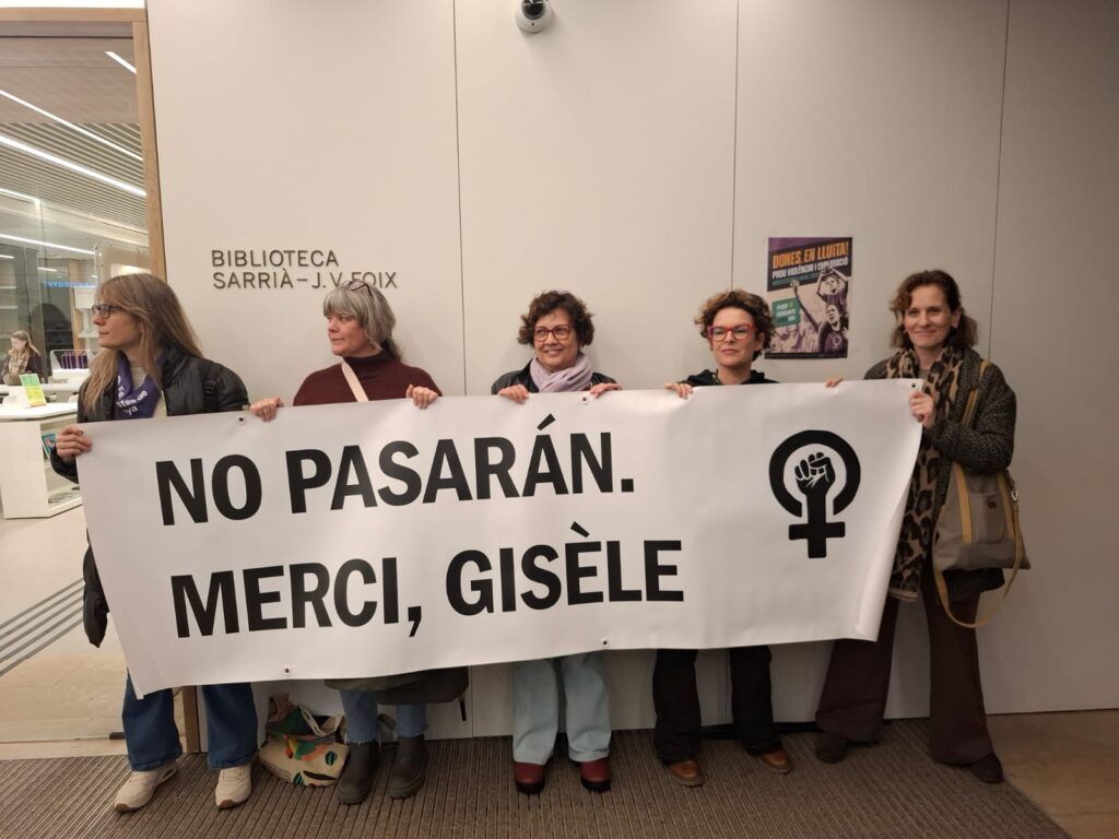 A la salida de la biblioteca, un grupo de feministas catalanas despedía a las asistentes con una manta en la que agradecían la valentía de Pelicot e invitaban a sumarse a la marcha que con motivo del Día Internacional de la Mujer, realizarán este domingo.