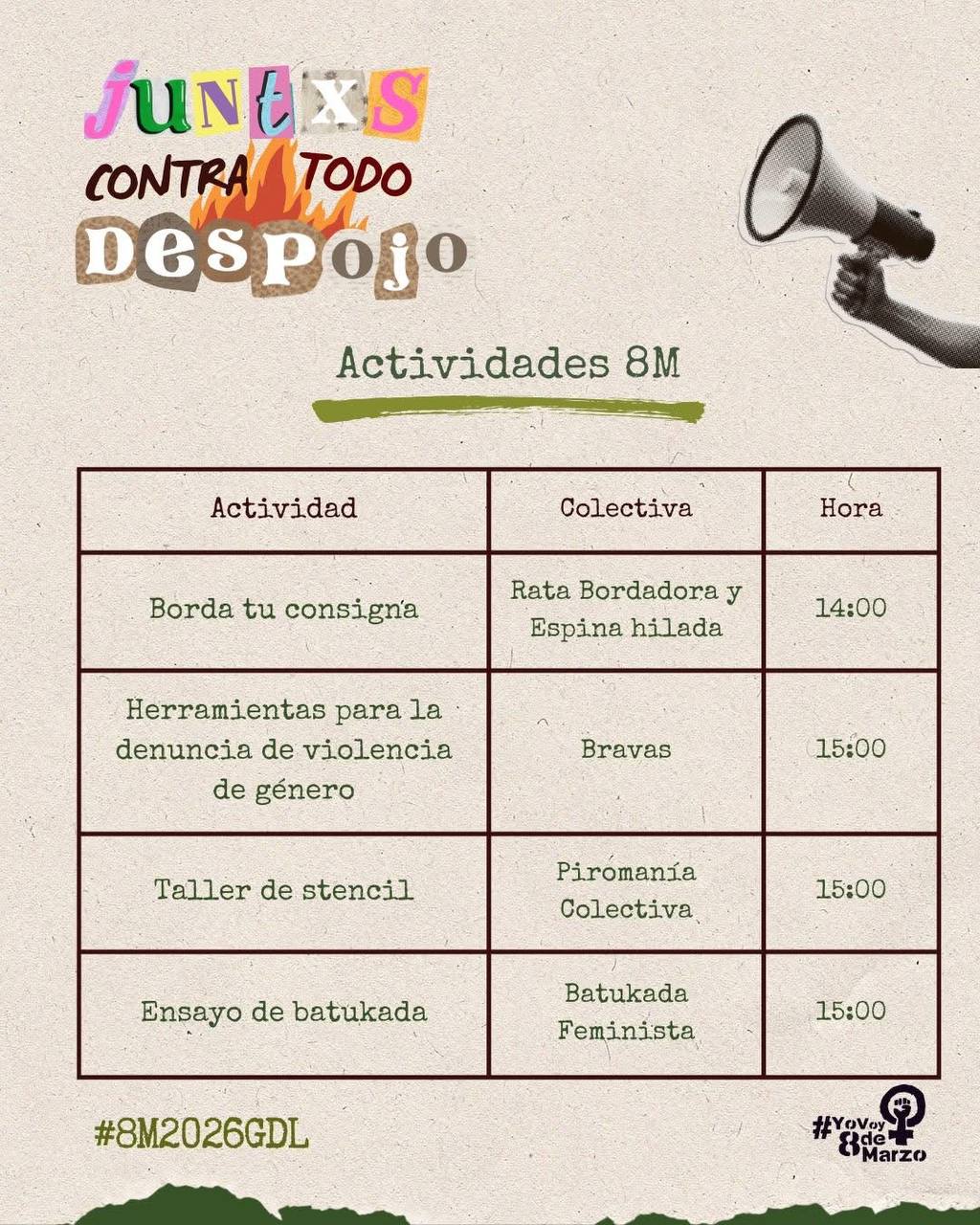 Guadalajara se prepara para la marcha convocada por la red #YoVoy8M bajo la consigna “Juntxs contra todo despojo”, con salida a las 16:00 horas desde Parque Morelos y un recorrido por Avenida Juárez que finalizará en el Andador Palestina. La movilización mantiene su carácter de denuncia ante las violencias de género, los feminicidios, las desapariciones y otras formas de despojo. El desplazamiento en calle se articula con distintas actividades que buscan fortalecer el tejido comunitario de forma previa, intermedia y posterior al 8 de marzo.