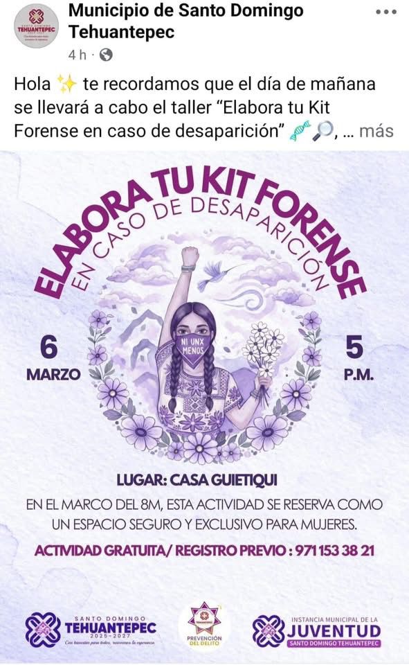 Oaxaca de Juárez.- El ayuntamiento de Santo Domingo Tehuantepec ubicado en Oaxaca parece haberse rendido ante el delito de desaparición de personas. Su estrategia ahora es capacitar a las mujeres para que elaboren su propio kit forense.
