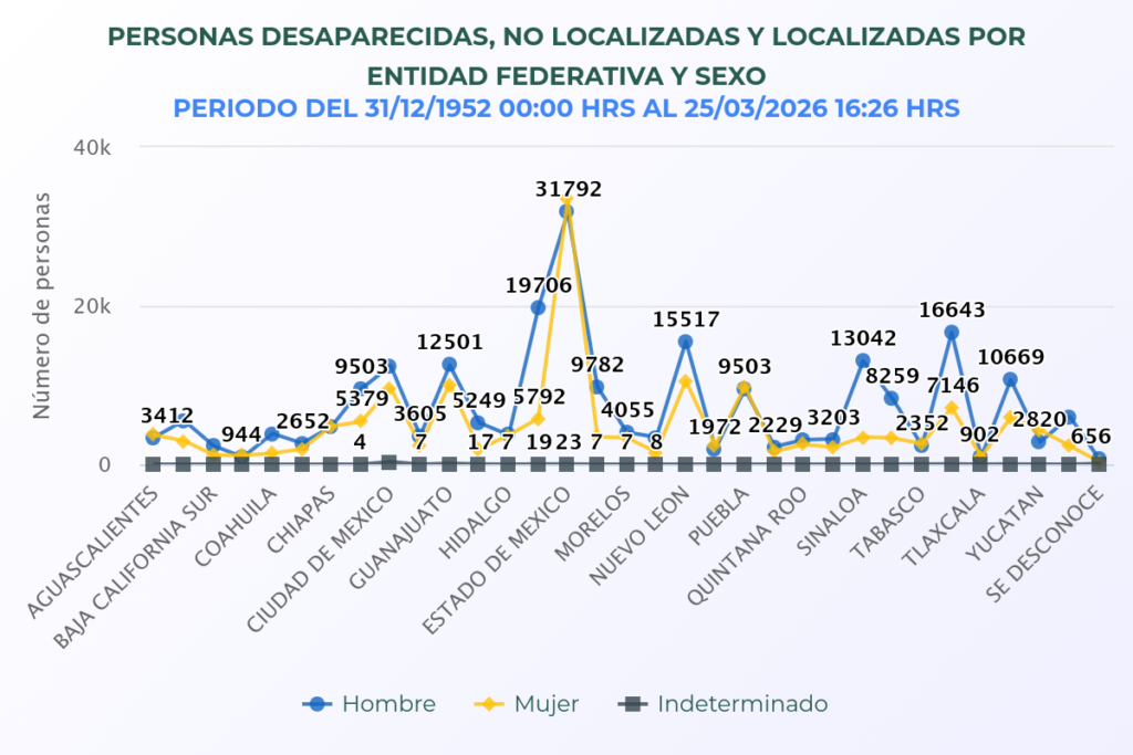 La mayoría fueron vistas por última vez en entidades como estado de México, Nuevo León, Guanajuato, Puebla y Ciudad de México; aunque hay estados como Aguascalientes, Pueblas, Campeche, Chiapas, Oaxaca, Tabasco y Tlaxcala donde el número de mujeres desaparecidas supera el de los hombres.