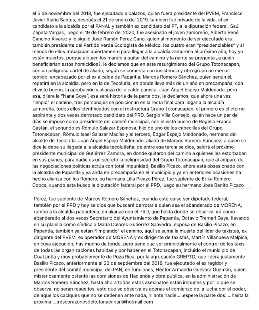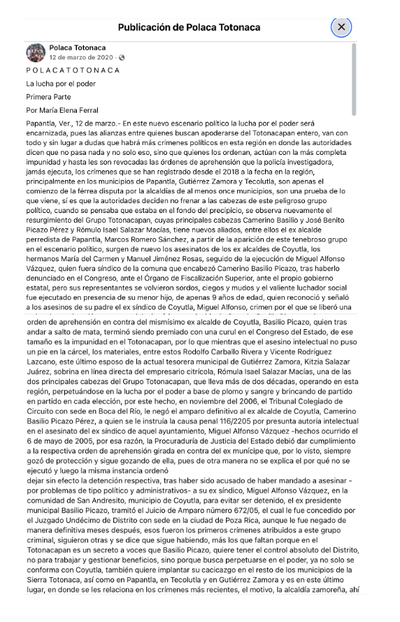 El 12 de marzo de este año, en su columna “Polaca Totonaca”, en Quinto Poder, denunció la corrupción e impunidad con la que operaba el grupo político “Totonacapan”.