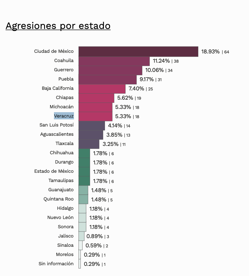 En agresiones por estado, este informe destaca que Veracruz ocupa el lugar número 8 a nivel nacional por el número de registros.