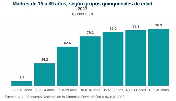 No obstante, los datos del INEGI muestran que las mujeres comienzan a convertirse en madres a edades muy jóvenes: 7.7% de las madres registradas son adolescentes entre 15 a 17 años, 36.2% son jóvenes de 20 a 24 años y 62.6% son mujeres de 25 a 29 años. Dichas edades coinciden con la vida escolar de las mujeres, ya que se encuentran entre la preparatoria y la universidad.
