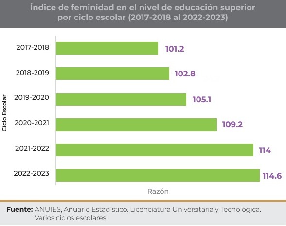 Aun así, las estadísticas muestran que esta brecha poco a poco se va revirtiendo, pues las mujeres conforman la mayoría de las matrículas en bachillerato, universidad y posgrado. Entre 2017 a 2018 por cada 100 hombres matriculados en todos los niveles educativos, desde la primaria hasta la educación superior, había 101.2 mujeres inscritas. Para el ciclo escolar 2022 a 2023, por cada 100 hombres hubo 114.6 mujeres.
