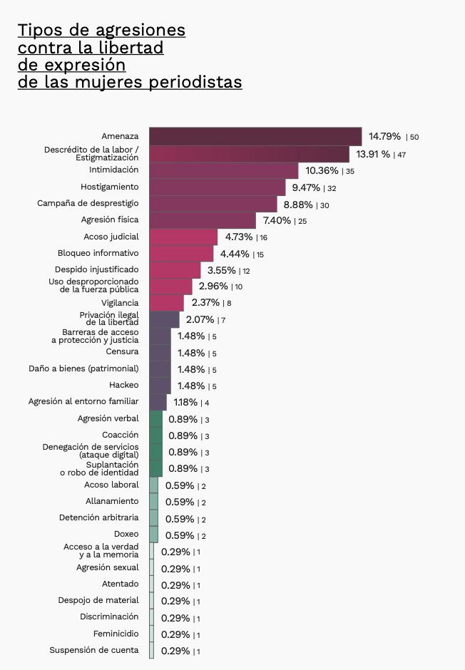 En su informe «Entre el discurso y la desprotección», se dio a conocer que entre los tipos de agresiones contra las mujeres periodistas existieron amenazas (14.79%), descrédito de su labor y estigmatización (13.91%), intimidación (10.36%), hostigamiento (9.47%) y campaña de desprestigio (8.88%). En los casos donde existen graves violaciones a los derechos humanos se encuentra la privación ilegal de la libertad, detención arbitraria, agresión sexual, feminicidio y atentado.