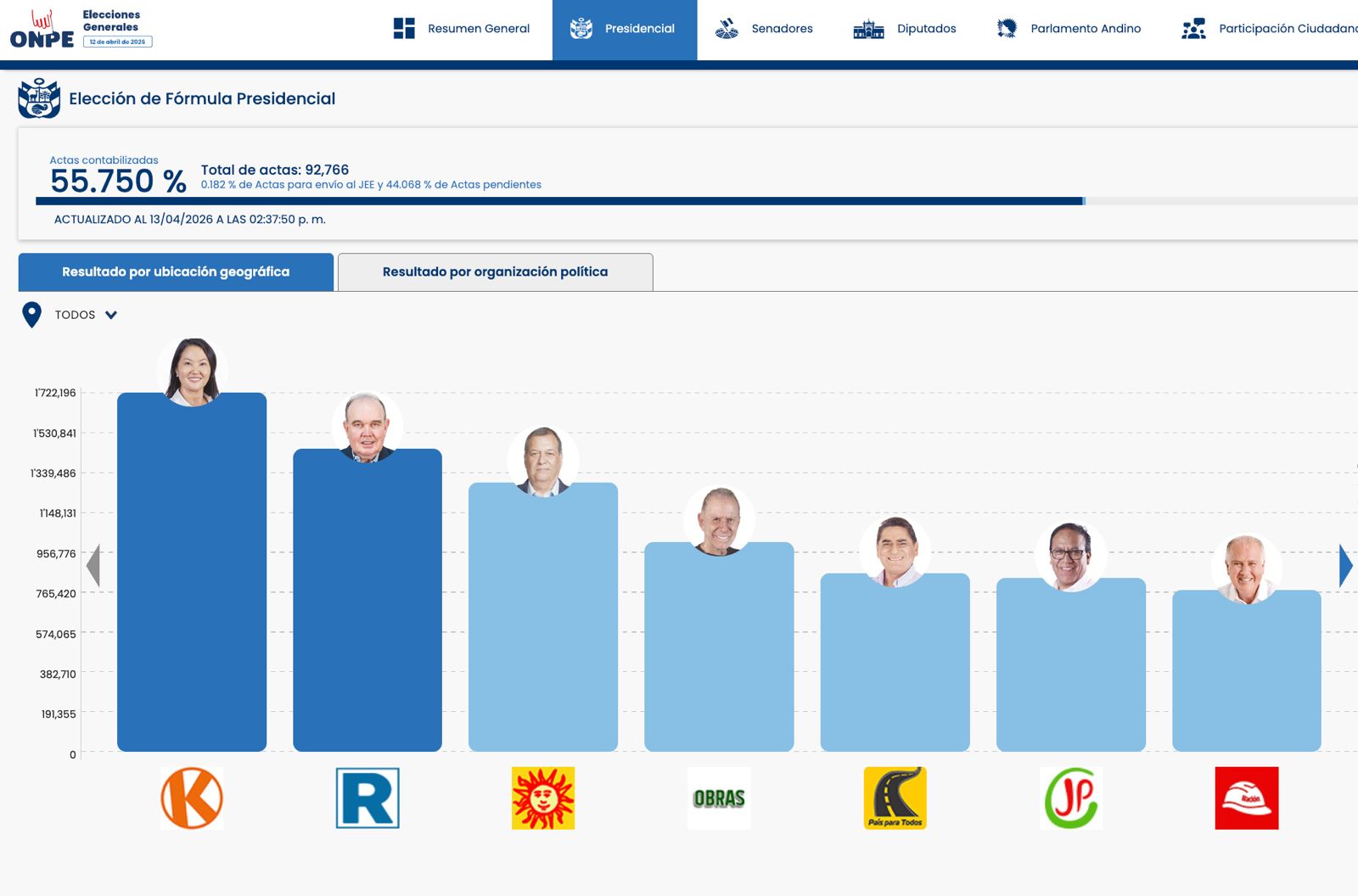 Esta es la cuarta vez que Keiko Fujimori se postula para la Presidencia de Perú bajo el lema «Vuelve Fujimori, vuelve el orden» y este año superó a su competencia con más de 2 millones de votos, es decir, el 16.88% del apoyo del electorado de solo 75.86% actas computarizadas. La baja contabilización de votos se debe a fallas logísticas que provocaron que, en 13 locales de votación, ubicados en los distritos de San Juan de Miraflores, Lurín y Pachacamac, no se pudo ejercer el voto ese día.